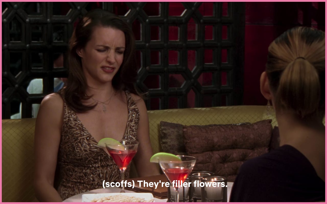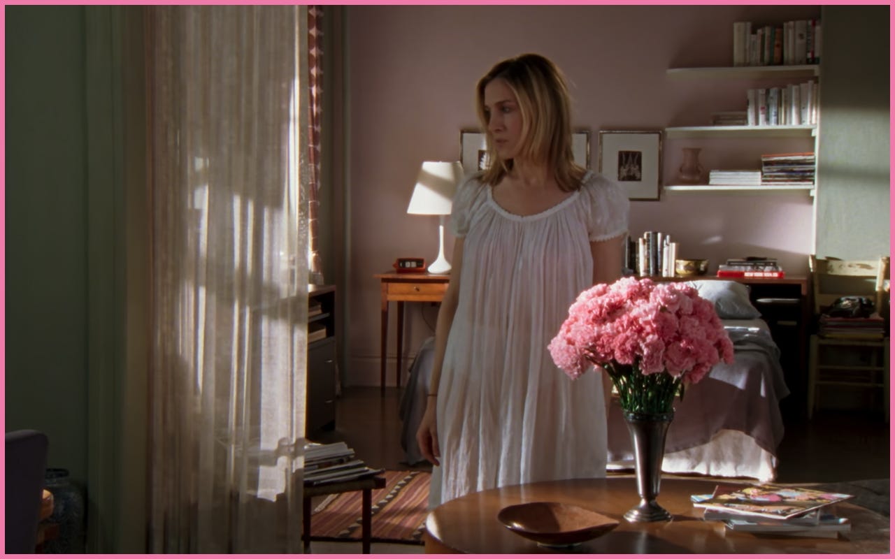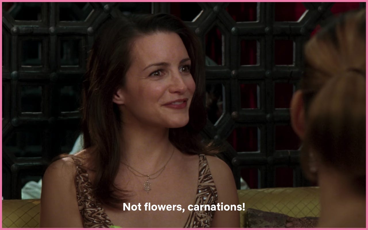 Although if a man gifted me a bouquet of carnations, I’d be a little peeved (it’s that serious). In Sex and the City season 6 episode 6, “Hop, Skip and a Week” Carrie’s boyfriend Berger gives her a bouquet of pink carnations. This happens after Charlotte says carnations are filler flowers and show a lack of effort on a guy’s part. Carrie chimes in and says she actually likes carnations, especially pink ones, and that they are “making a comeback.” Not long after, Berger shows up at Carrie’s apartment with a surprise bouquet of pink carnations. Carrie loves the flowers and kisses him.