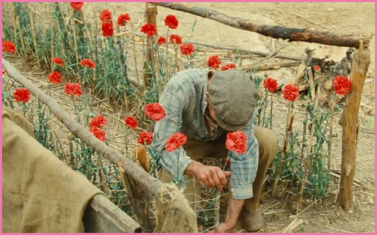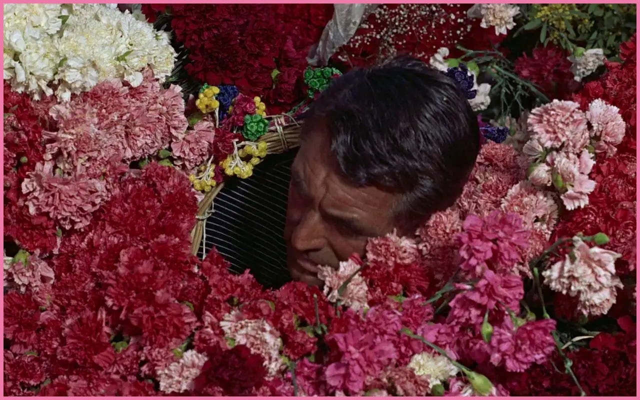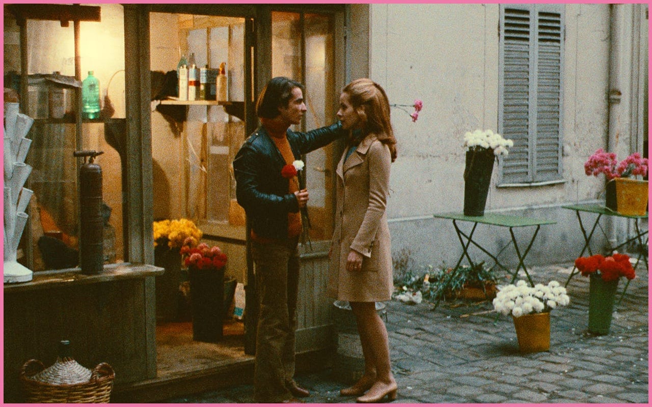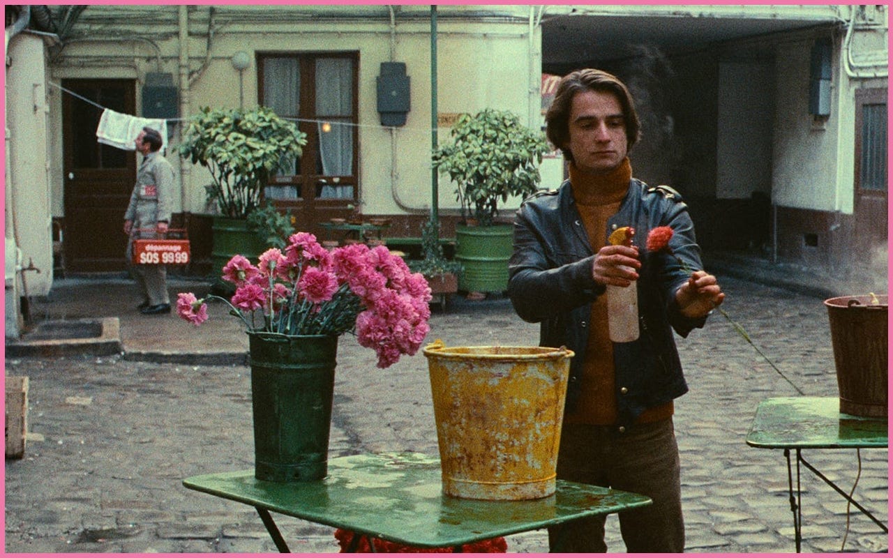 In the opening scene of Bed and Board (1970), Jean‑Pierre Léaud plays Antoine Doinel, working in a courtyard trying to dye carnations for flower shops. His experiments with coloring agents quickly go awry, leaving him with ruined flowers and ultimately costing him his job.