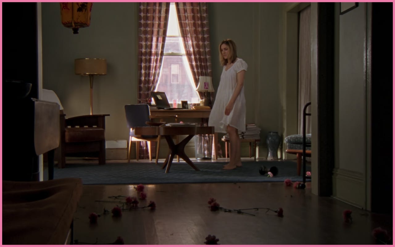 The episode ends in a classic Sex and the City and slightly cinematic way, with Berger secretly leaving Carrie’s apartment and breaking up with her via a Post-it note that says, “I’m sorry I can’t, don’t hate me.” Carrie knocks over the vase sending the flowers scatter across her apartment while she stands there quietly. Woah.